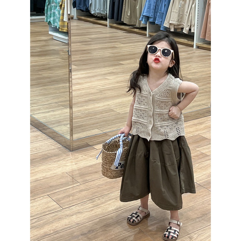 ملابس أطفال 2024 ربيع وصيف جديد للأطفال سترة محبوكة مجوفة سترة بنات عادية فضفاضة واسعة الساق السراويل