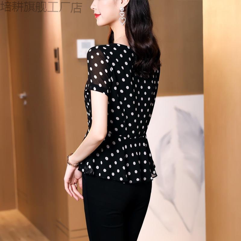 قميص نسائي أسود منقط بأكمام قصيرة موضة الصيف مزاجه سليم صالح التخسيس النمط الغربي الشيفون نقطة