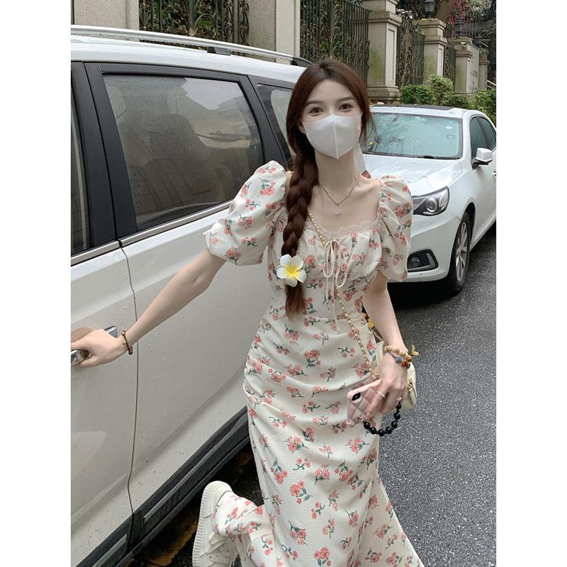 طوق مربع نفخة كم فستان زهري الصيف المرأة النمط الفرنسي لطيف الراقية الدانتيل متابعة الخصر التخسيس فستان استراحة الشاي