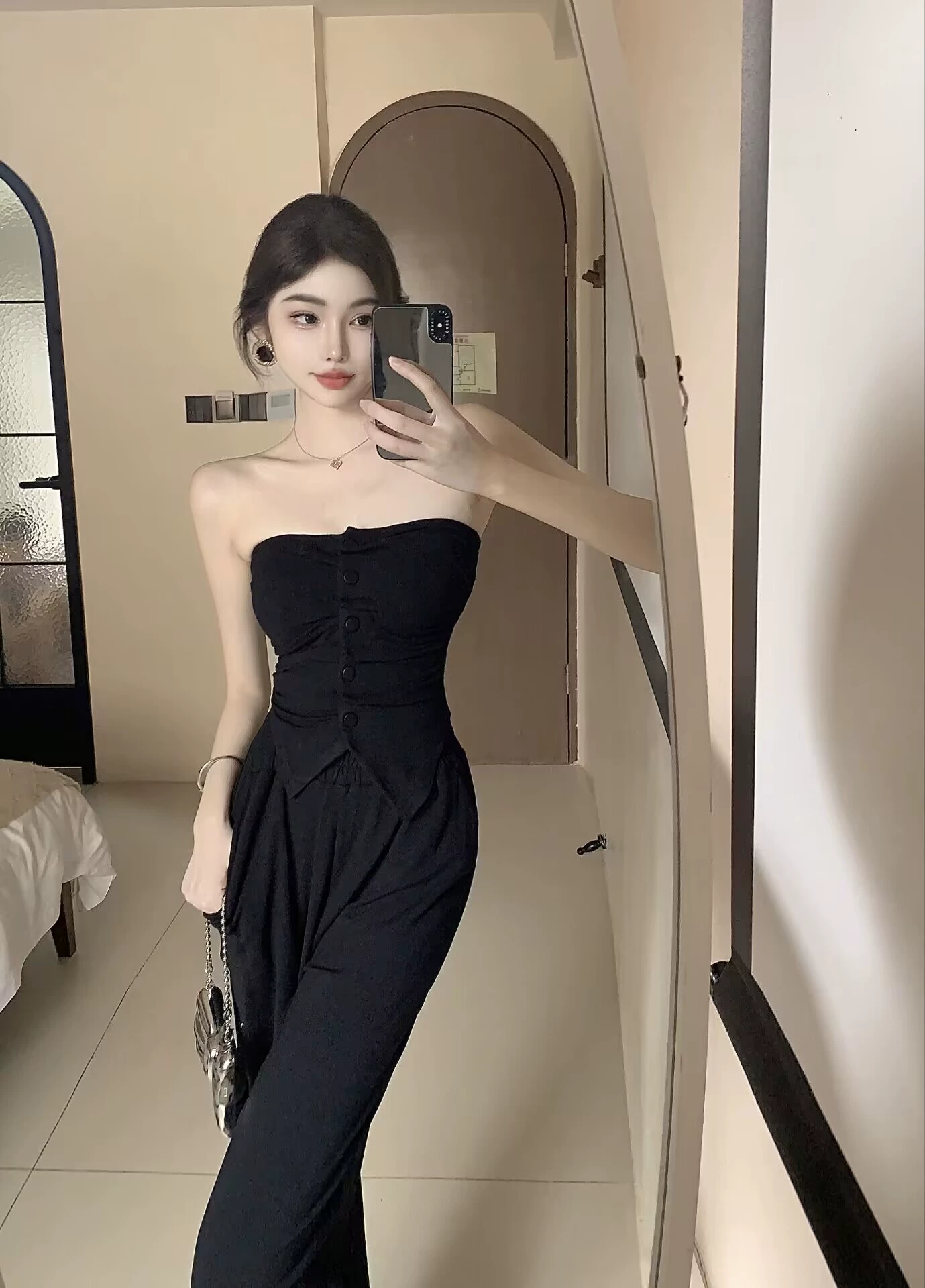 بدلة كورية مثيرة للفتيات مكونة من قطعتين، توب أنثوي بدون أكتاف، سترة مطوية رفيعة، سراويل كاجوال مرنة عالية الخصر للصيف