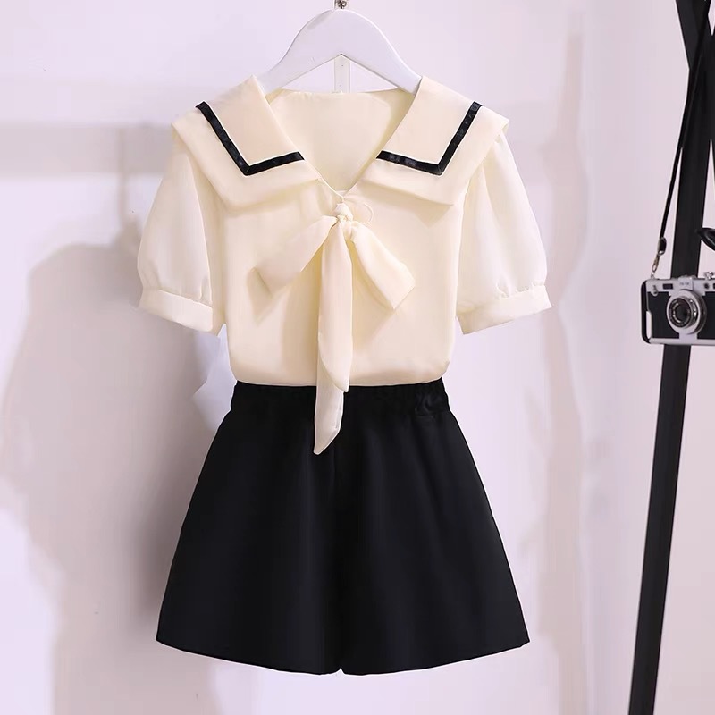 بدلة بناتي على الطراز الغربي لصيف 2022 ملابس أطفال جديدة كبيرة من الشيفون بأكمام قصيرة ملابس بناتي مشهورة على الإنترنت على الطراز الكوري بدلة مكونة من قطعتين