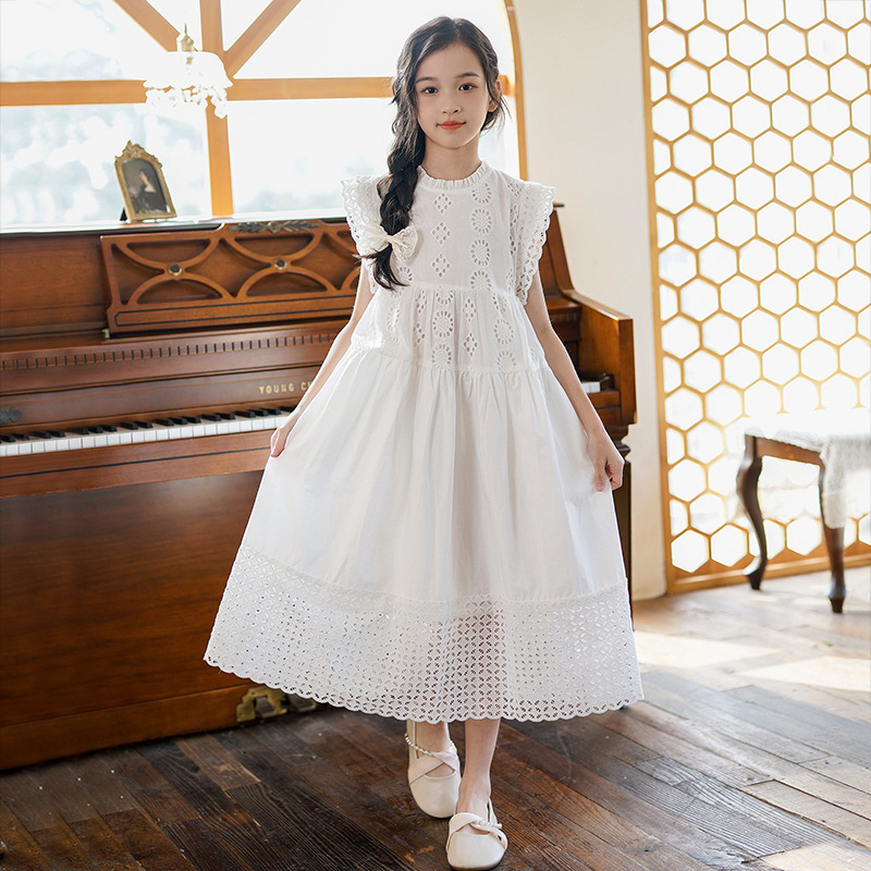 فستان الأميرة للفتيات فستان صيفي بأكمام طويلة من الدانتيل المجوف 2024 فستان جديد للأطفال المتوسطين والكبيرين للفتيات الصغيرات