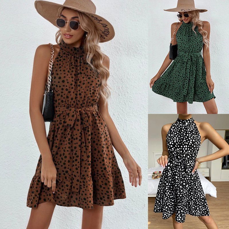 التجارة الخارجية عبر الحدود أمازون 2023 الأوروبية والأمريكية الصيف بلا أكمام نقطة الطباعة الدانتيل متابعة الخصر فستان مكشكش للنساء