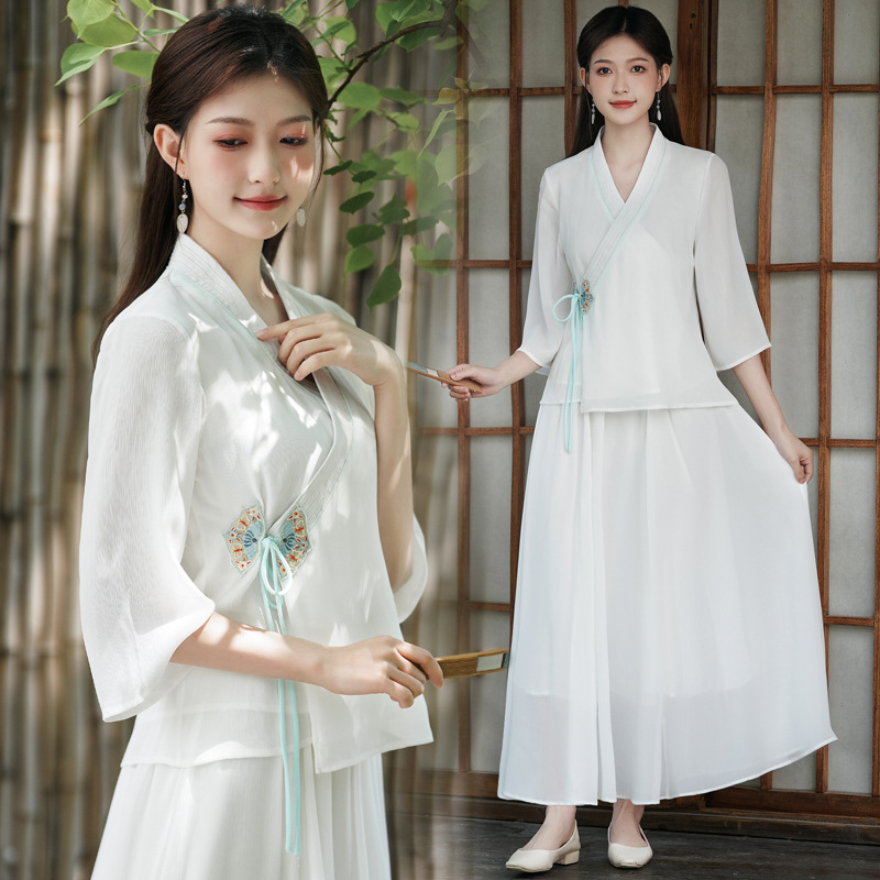 صيف جديد النمط الصيني زن الملابس النسائية هان عنصر عبر طوق النمط الصيني hanfu أعلى الجنية جو شي الأذن قطف الملابس