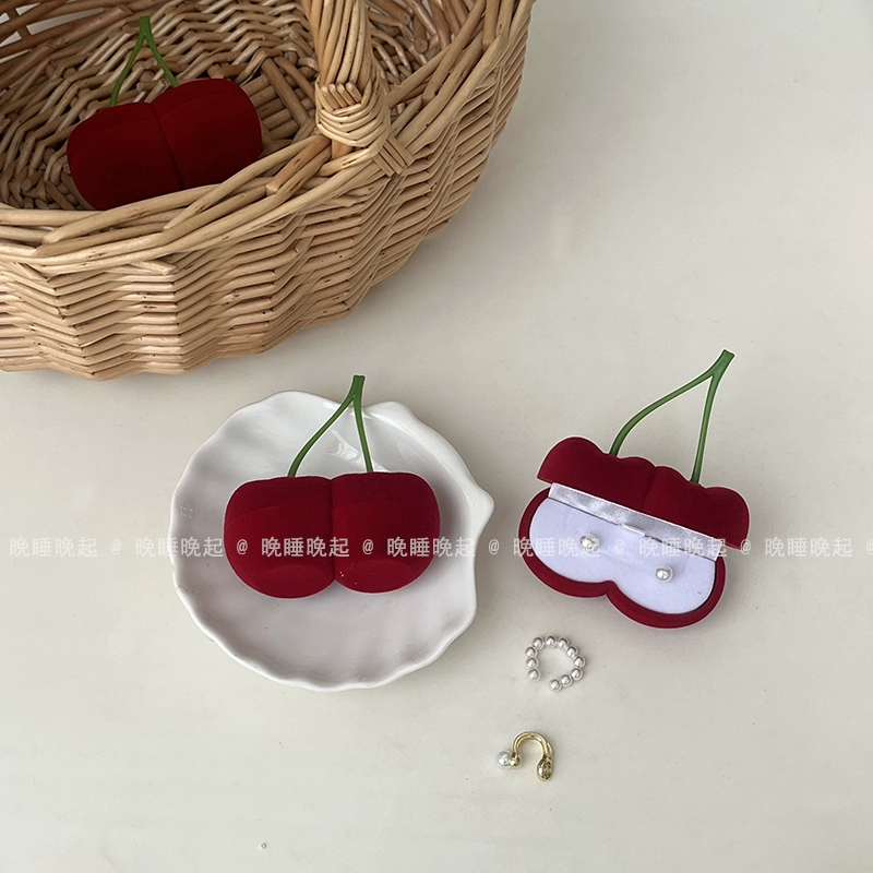 صندوق تخزين أقراط على شكل حلقة مجوهرات للفتيات من الكرز الأحمر المخملي اللطيف