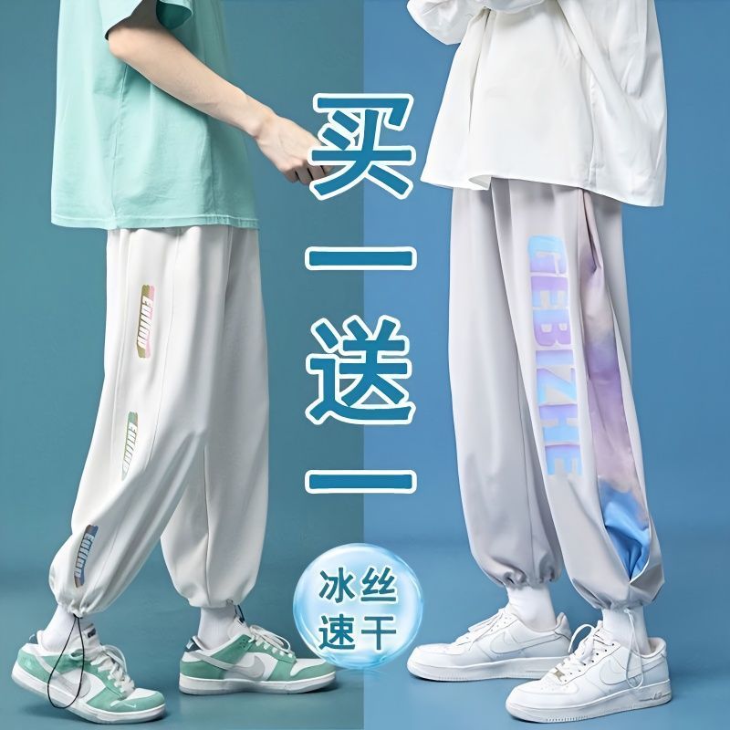 السراويل الرجالية الصيف الحرير الجليد التجفيف السريع الرياضة الصيف رقيقة فضفاضة مستقيم الرباط Ins العصرية عادية الكاحل طول السراويل عرق السراويل