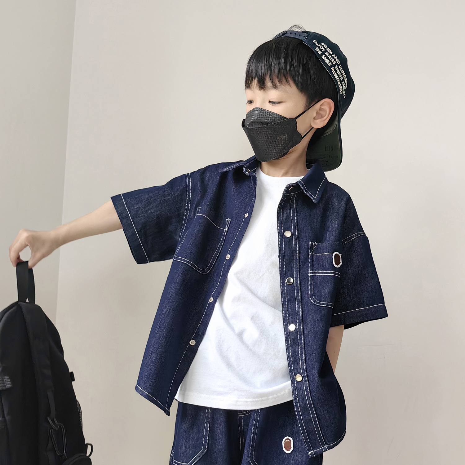 24 الصيف اليابانية ملابس الأطفال المتوسطة والكبيرة الدنيم رداء علوي غير رسمي العصرية القرد الصغيرة المطرزة اللون خالية الدنيم قصيرة الأكمام قميص