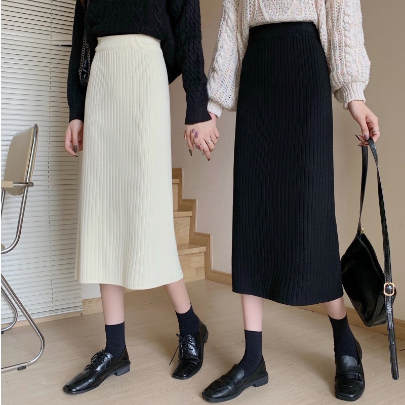 تنورة نسائية سوداء محبوكة تنورة صغيرة للخريف والشتاء منقسمة بخطوة واحدة غمد عالية الخصر تنورة ميدي على شكل حرف A تنورة صوفية