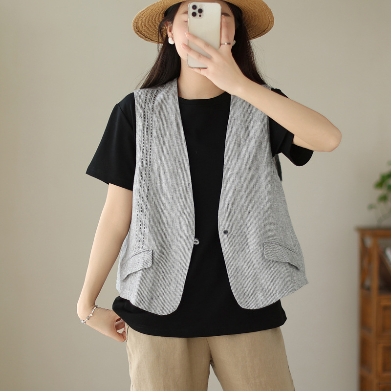 الفنية الرجعية المطرزة مخطط الكتان سترة المرأة الصيف لباس خارجي فضفاض مكدسة سترة القطن والكتان أعلى رقيقة