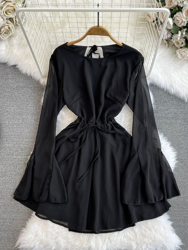 فستان من الشيفون على شكل حرف A بأكمام طويلة بدون ظهر من Yujie Trumpet