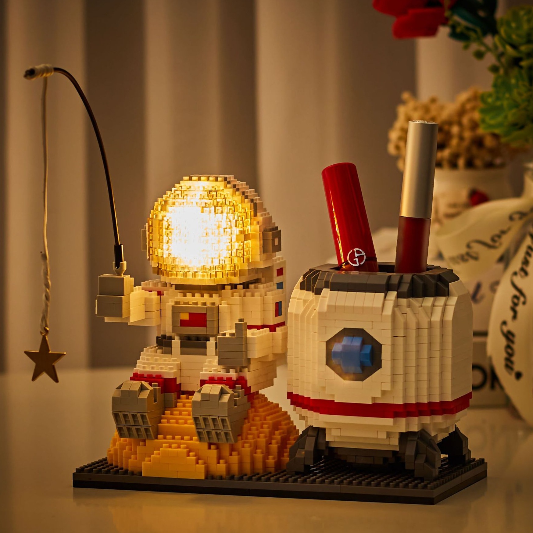 حافظة أقلام رائد فضاء مجمعة لبنات البناء لتخزين سطح المكتب وحلي للأولاد والبنات سلسلة هدية عيد ميلاد
