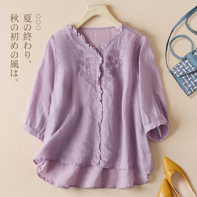 الرجعية الفن الخامس الرقبة الفطر الدانتيل نصف كم المرأة الصيف المطرزة القطن الكتان فضفاض البلوز تي شيرت