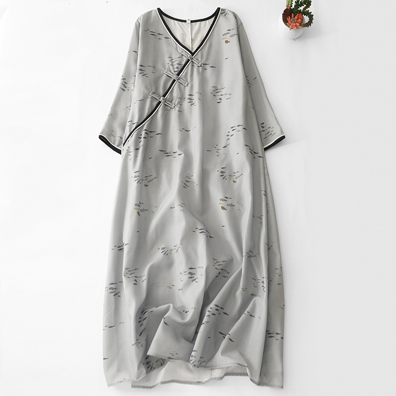 فستان Real Shot مُحسّن من Cheongsam مطبوع برقبة على شكل حرف V وفتحة مائلة وإبزيم وأكمام سبع نقاط ومضاد للخرافية