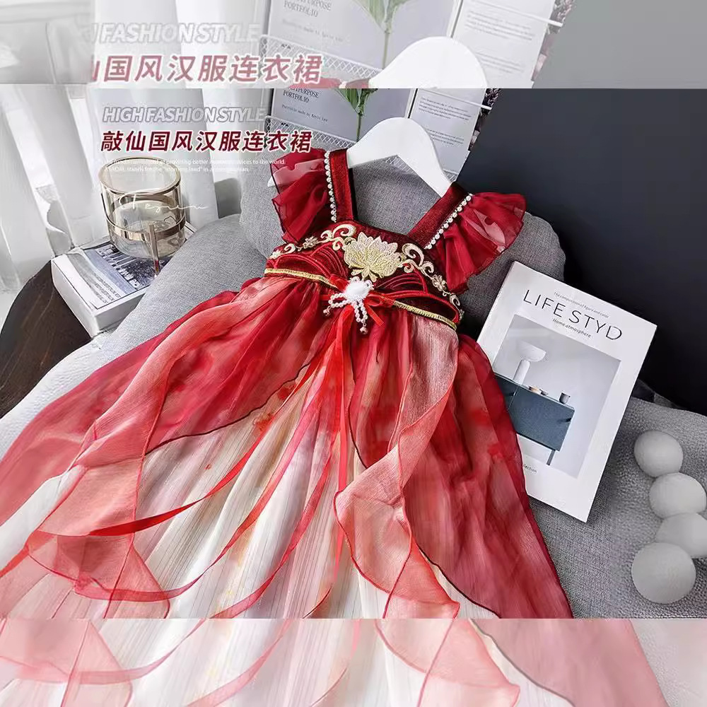 Hanfu الفتاة الأحمر كوي النمط الصيني الفتاة الثقيلة فستان مطرز الصيف الأطفال الأميرة تنورة العتيقة الأزياء
