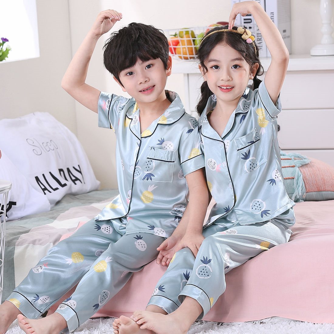 بيجامات أطفال بنات وأولاد بدلة بأكمام قصيرة حرير ثلجي للأطفال للربيع والصيف كنز محاكاة حرير تكييف هواء ملابس منزلية ملابس أطفال