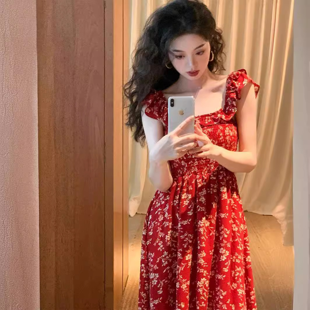 الفرنسية الرجعية الدافئة الأحمر الأزهار الصغيرة يطير كم مربع طوق اللباس الصيف جديد ضيق الخصر ضئيلة طويلة شكل الكمثرى