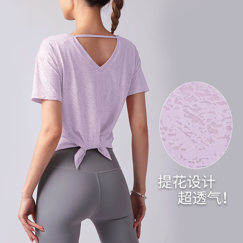 ملابس تدريب البيلاتيس صيفية خفيفة الوزن ملابس لياقة بدنية رياضية جاكار فتحة بلوزة نسائية بأكمام قصيرة قابلة للتنفس ملابس اليوغا
