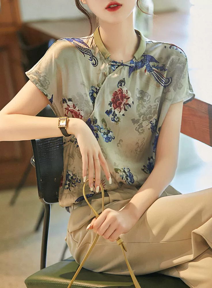 قميص حرير التوت الصيني الفضفاض بأكمام قصيرة شيونغسام محسن