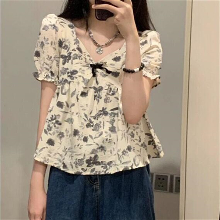 الفرنسية الرجعية الحبر فقاعة الأزهار قصيرة الأكمام قميص المرأة الصيف شيك الطازجة الحلو دمية قصيرة القميص الأعلى