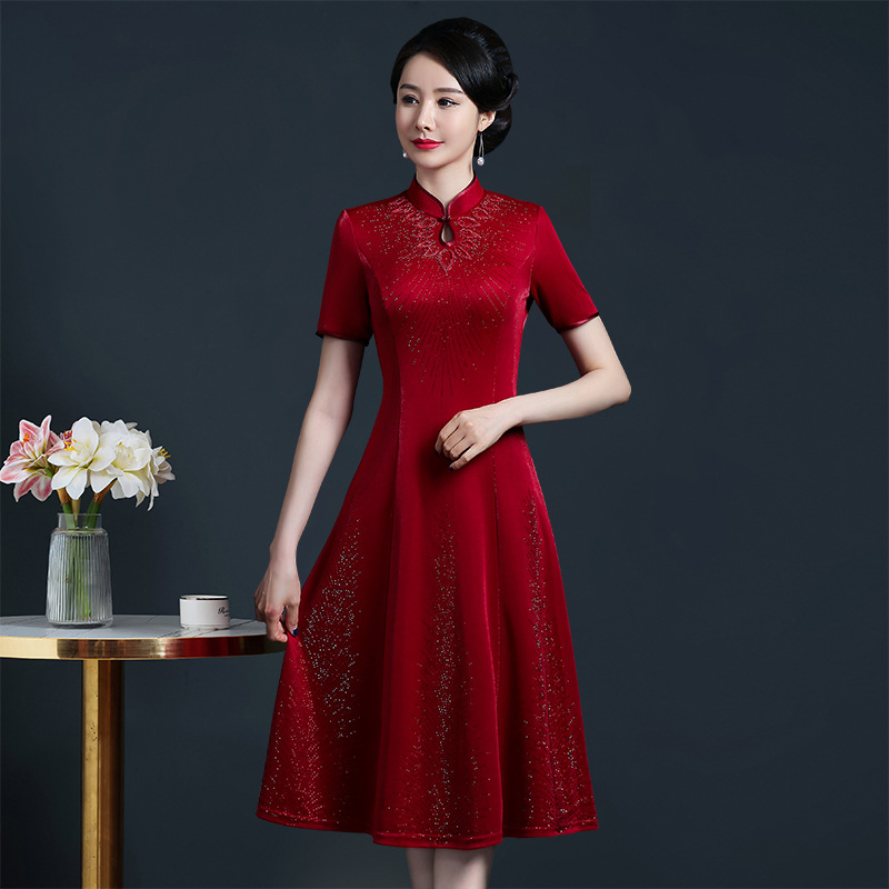 صيف جديد نمط قصير الأكمام أنيق عصري سليم صالح الوقوف الياقة مطرز فستان ميدي الأم البدلة