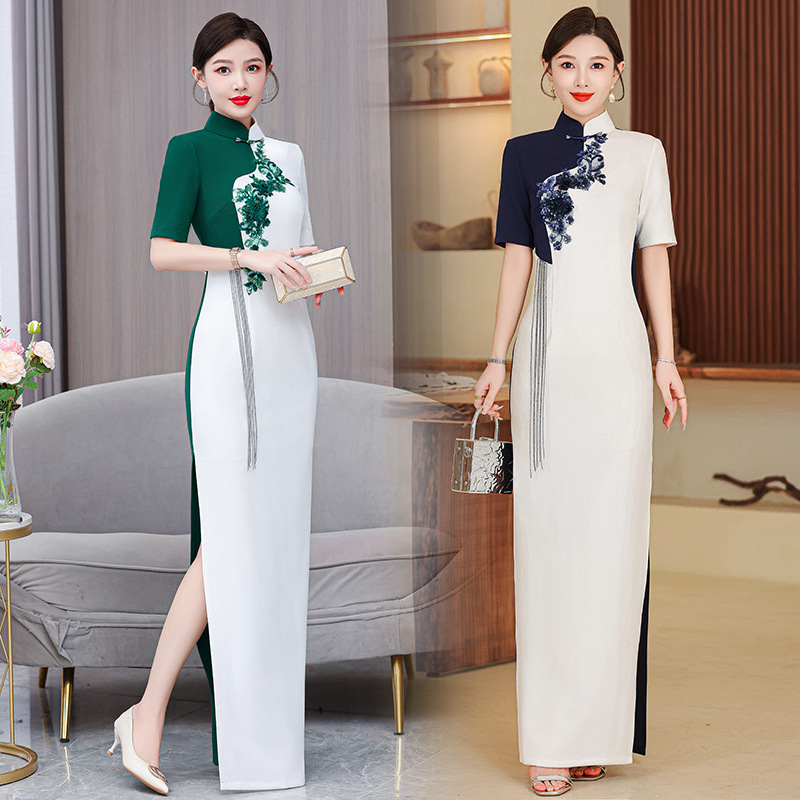 النمط الصيني الجديد الرجعية الراقية عرض شيونغسام تمتد غير الكي طويلة مطرزة أنيقة النمط الصيني مرحلة الأداء الملابس للنساء