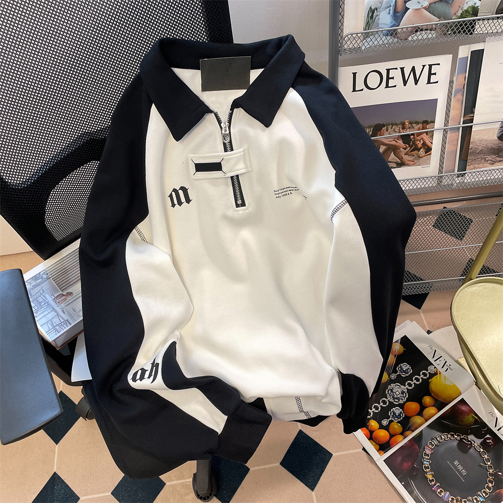 سترة نسائية ذات ياقة بولو بسحاب على طراز Preppy بتصميم عتيق أمريكي، سترة هيب هوب للسيدات باللونين الأسود والأبيض بلون متباين