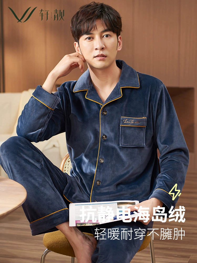 بيجامة جديدة للرجال ربيع وخريف زائد مخمل أكمام طويلة سميكة مخمل مرجاني دافئ ملابس منزلية خريف وشتاء بدلة جزيرة مخملية