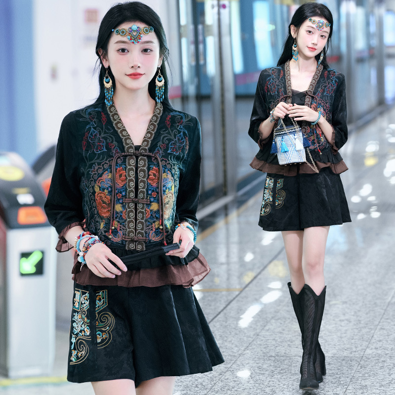 لقطة حقيقية على الطراز الصيني الجديد ملابس هانفو النسائية المحسنة والتطريز الثقيل سترة على شكل حرف v بلون مغاير على الطراز الوطني بدلة من ثلاث قطع