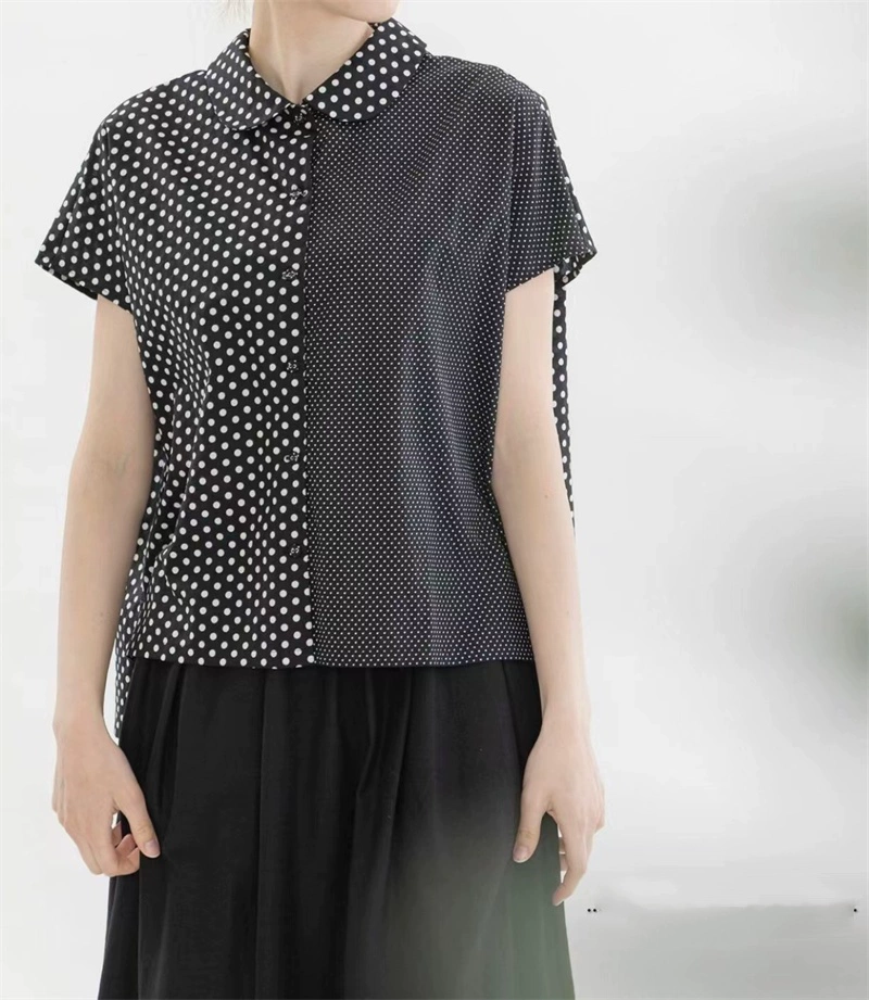الموقع الرسمي قميص بأكمام قصيرة متباين الألوان للنساء 2024 صيف جديد نمط بولو بياقة كبيرة الحجم من القطن والحرير قطعة علوية رفيعة