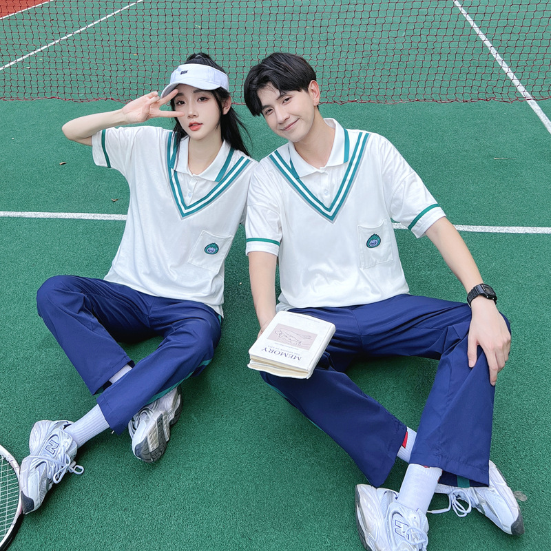 لقطة حقيقية للزوجين الصيف بأكمام قصيرة للرجال والنساء نمط الكلية بدلة بأكمام قصيرة الطلاب التخرج صورة زي مدرسي زي الطبقة