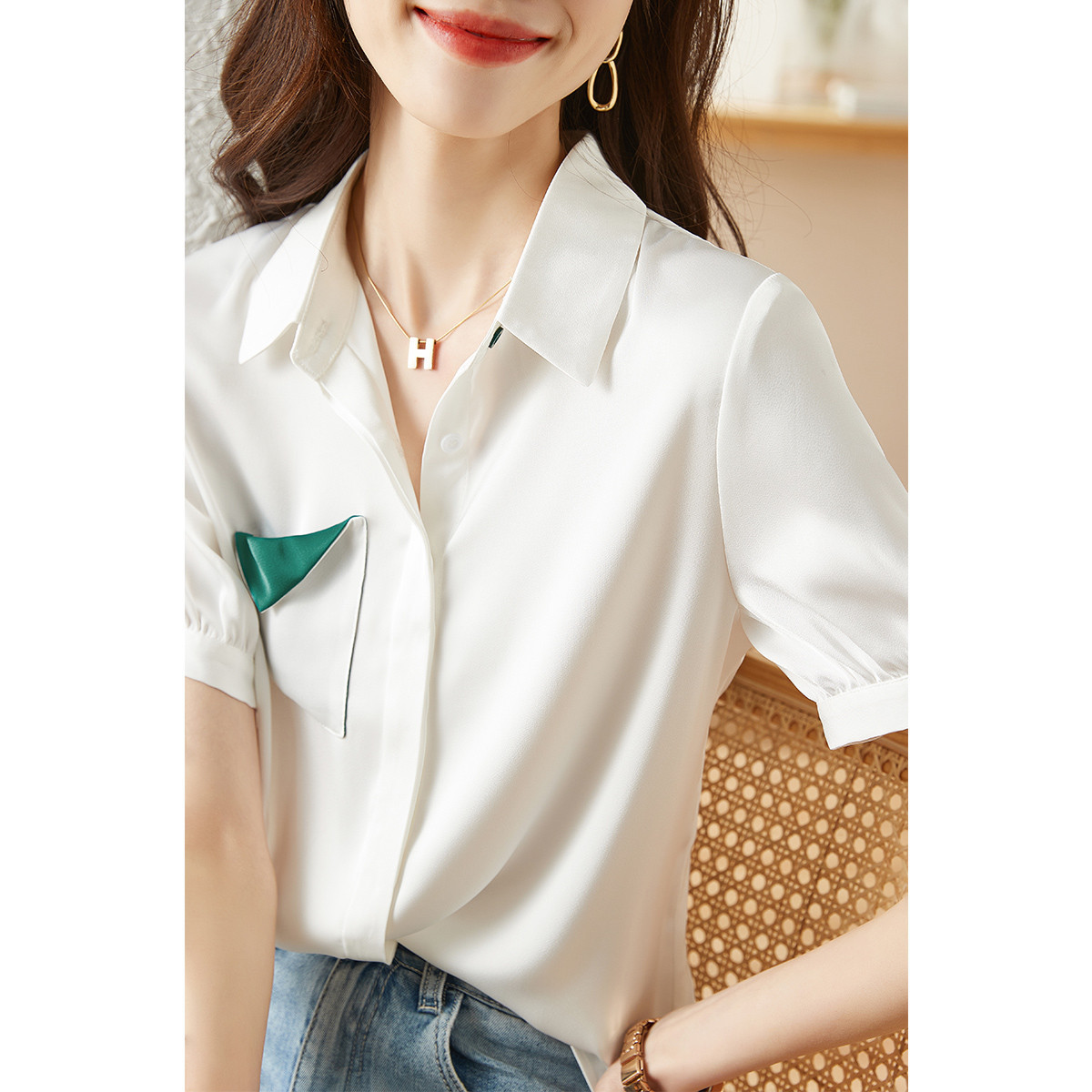 الفرنسية الشيفون الأعلى التباين اللون جيب قميص بسيط 2024 الصيف قصيرة الأكمام المألوف التنقل كل مباراة قميص نسائي