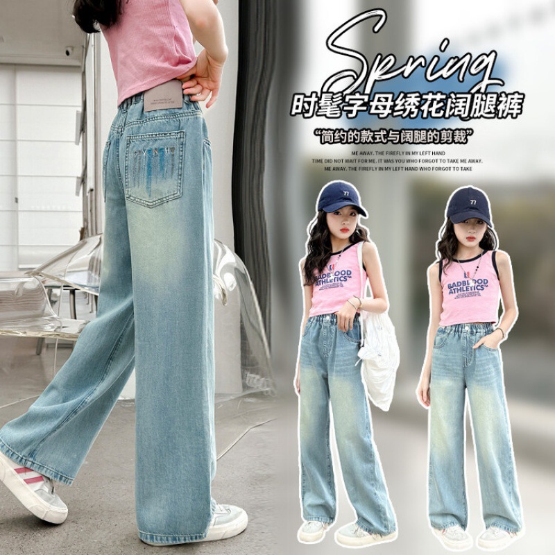 جينز بناتي 2024 سروال بناتي صيفي جديد عصري على الطراز الغربي مستقيم الساق واسع الساق سروال أطفال خفيف الوزن