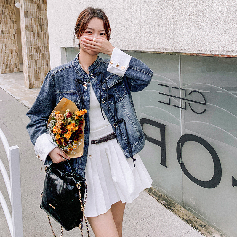 الجملة موقف طوق صغير فضفاض قصير جديد النمط الصيني الرجعية المتعثرة تصميم الشعور مشبك معطف الدنيم للنساء