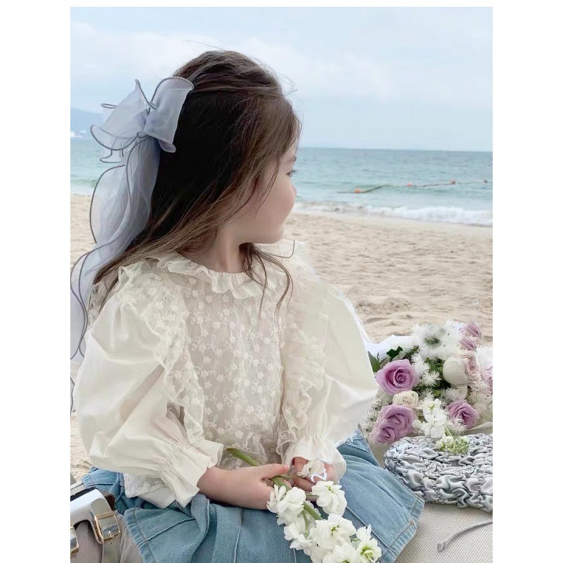طقم قميص للفتيات على الطراز الكوري مكون من قطعتين 2024 ربيع جديد للفتيات الصغيرات بياقة من الدانتيل وبلوزة من الدانتيل على الموضة