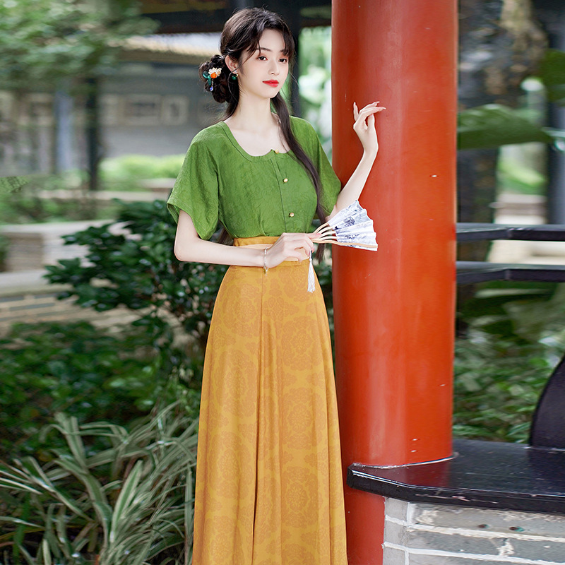 قميص قصير من Real Shot بياقة دجاج تانغ جاكار، جاكيت أبيض رقيق بأكمام قصيرة، جاكار ثمانية تنورة مكسورة، بدلة تنورة نصف طول