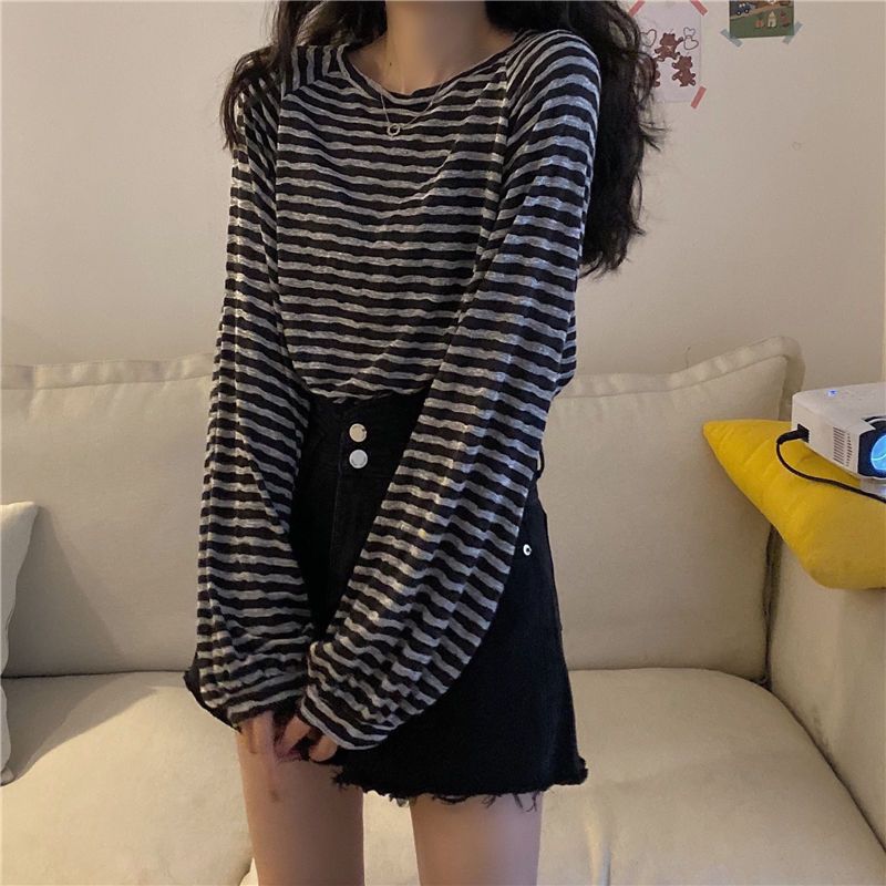أوائل الخريف تنوعا مخطط طويل الأكمام تي شيرت كامل الطالبات الكورية نمط فضفاض Harajuku كسول Ins نمط الخريف قميص داخلي
