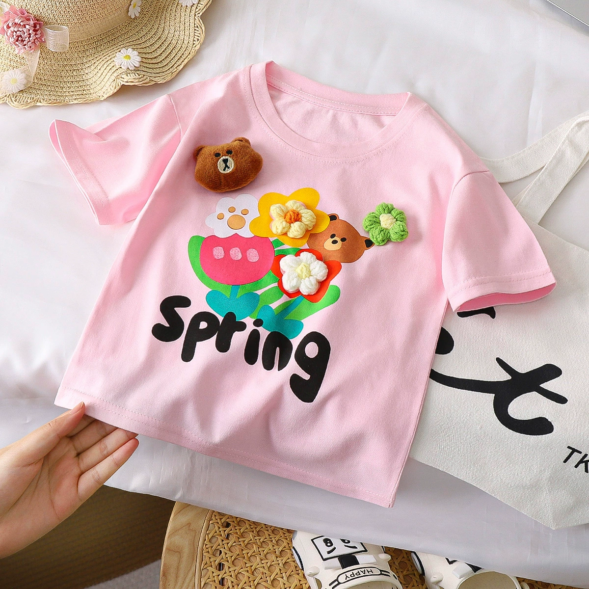 تي شيرت قصير الأكمام مصنوع من الحرير الجليدي بلون سادة للفتيات الصغيرات الطازجات