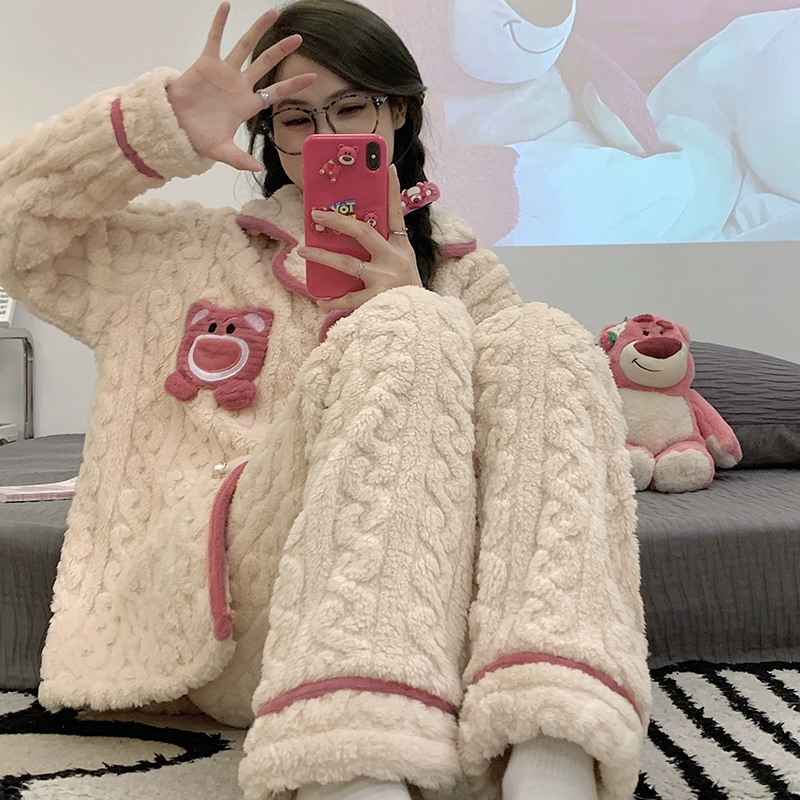 بيجامة مخملية مرجانية للنساء في الشتاء سميكة بالإضافة إلى أكمام مخملية شبكية كرتونية الرياح الحمراء فتاة حلوة خدمة منزلية شفة شتاء شتاء
