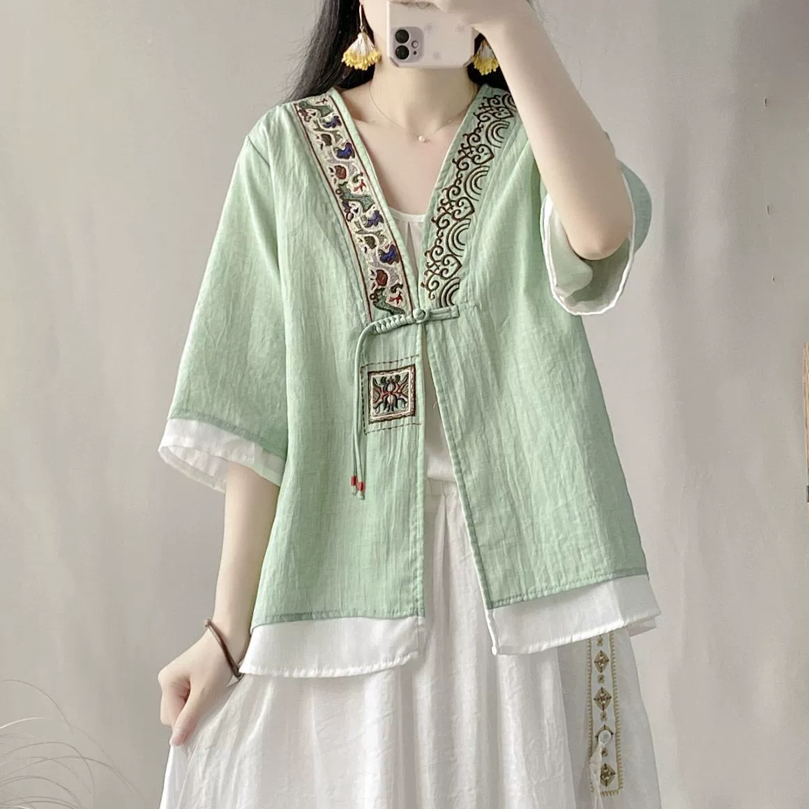 سترة من القطن والكتان بخمس نقاط على الطراز الصيني فضفاضة مطرزة ببدلة الشاي