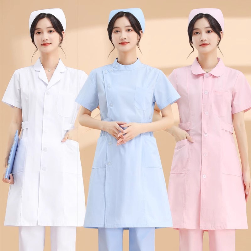 زي ممرضة العندليب معطف مختبر طويل الأكمام للنساء برقبة دائرية وأكمام قصيرة صيفي أبيض معطف مختبر كبير الحجم زي عمل الصيدلة أبيض