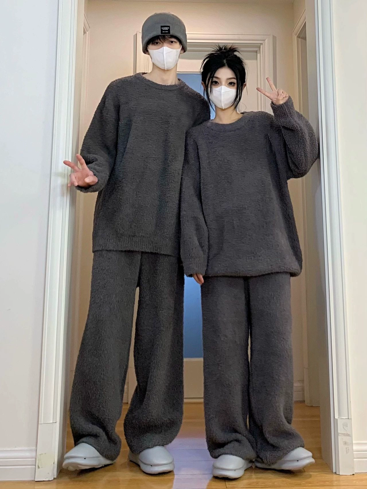 بيجامة زوجية مغطاة من المخمل نصف الجانب بلون خالص