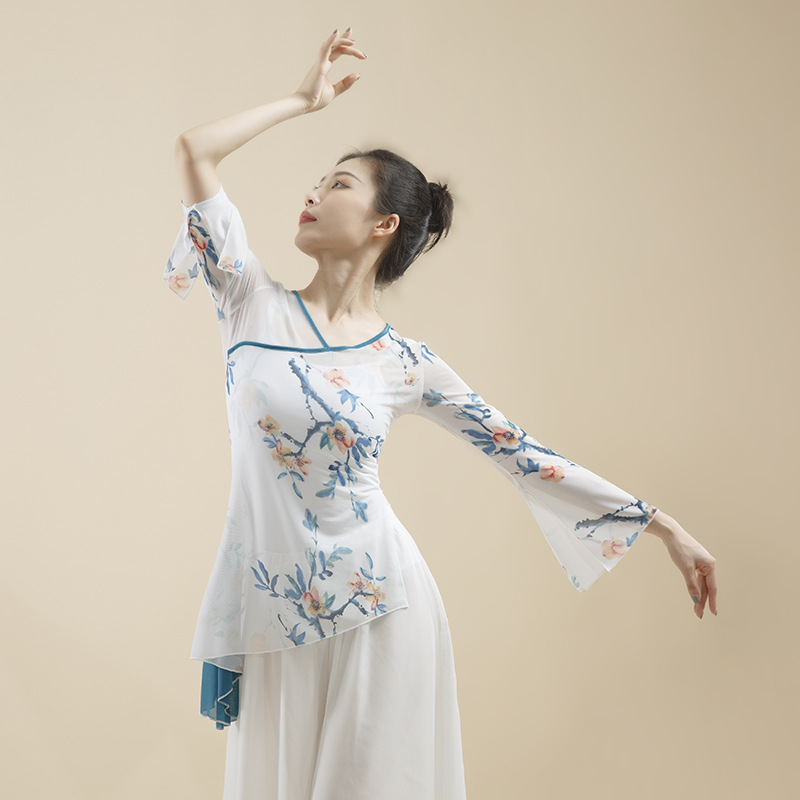 الجنية الهواء البوق كم الملابس الكلاسيكية ممارسة الرقص سترة الغزل شبكة الجسم قافية الجسم النمط الصيني ملابس الرقص الأنيقة