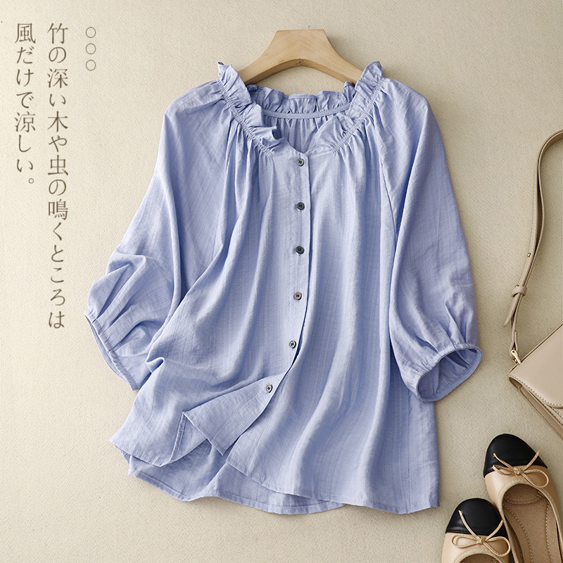 قميص بياقة مكشكشة مزين بالفطريات قميص نسائي صيفي 2023 رقيق يغطي اللحم للتخسيس قميص فني أنيق مكشكش