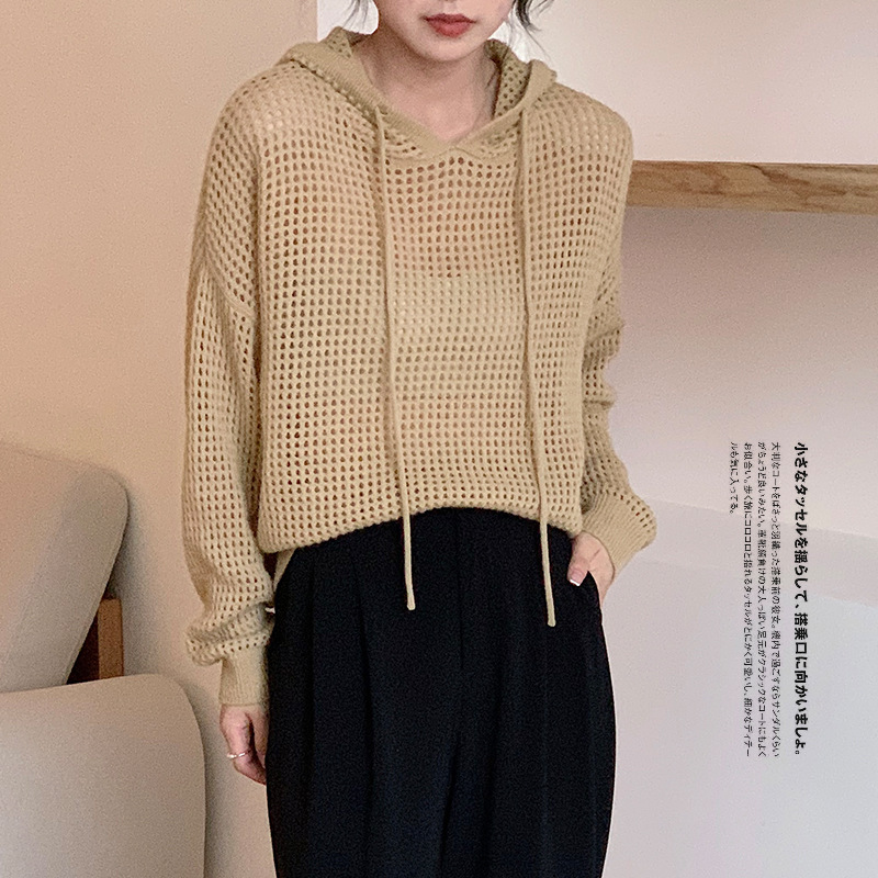 سترة بغطاء للرأس من الصوف برباط مجوف غير رسمي جديد ربيع 2024 من Puyuan للرياح الكسول سهلة المطابقة مع بلوزة فضفاضة للنساء