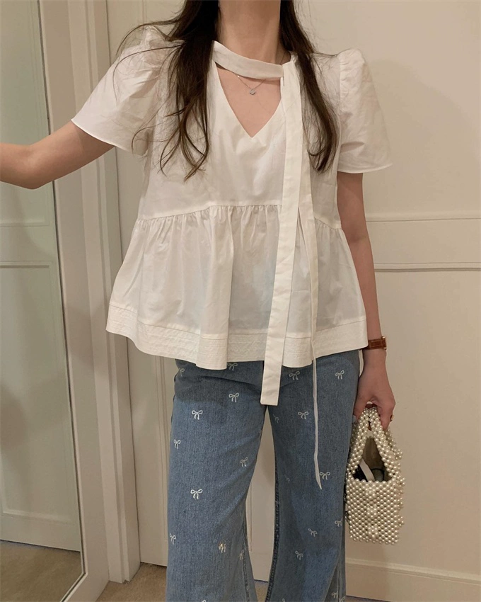 الكتف الأيمن صيف 2024 بلوزة جديدة ضيقة بأكمام قصيرة