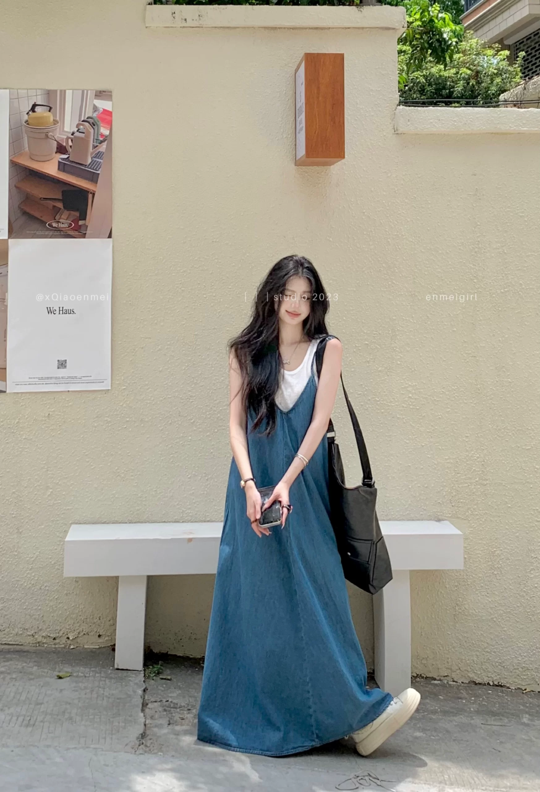 أوائل الربيع الرجعية فستان طويل فضفاض باللون الأزرق