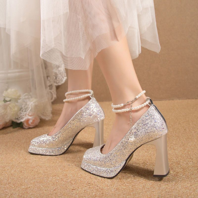 الشمبانيا نمط منصة للماء كعب سميك جديد ماري جين كريستال أحذية أحذية الزفاف أحذية الزفاف ساحة اصبع القدم أحذية عالية الكعب للنساء