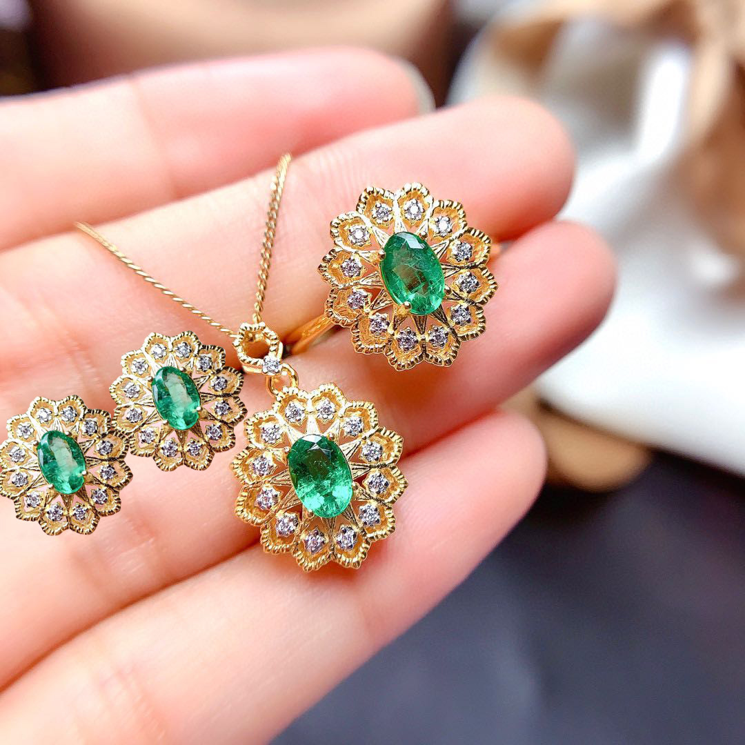 مجموعة مجوهرات الرفاهية للصرف الحي للبيع بالجملة مجموعة الزمرد المقلدة وقلادة مرصعة صغيرة وحلقة افتتاح وأقراط كنز ملونة للسيدات