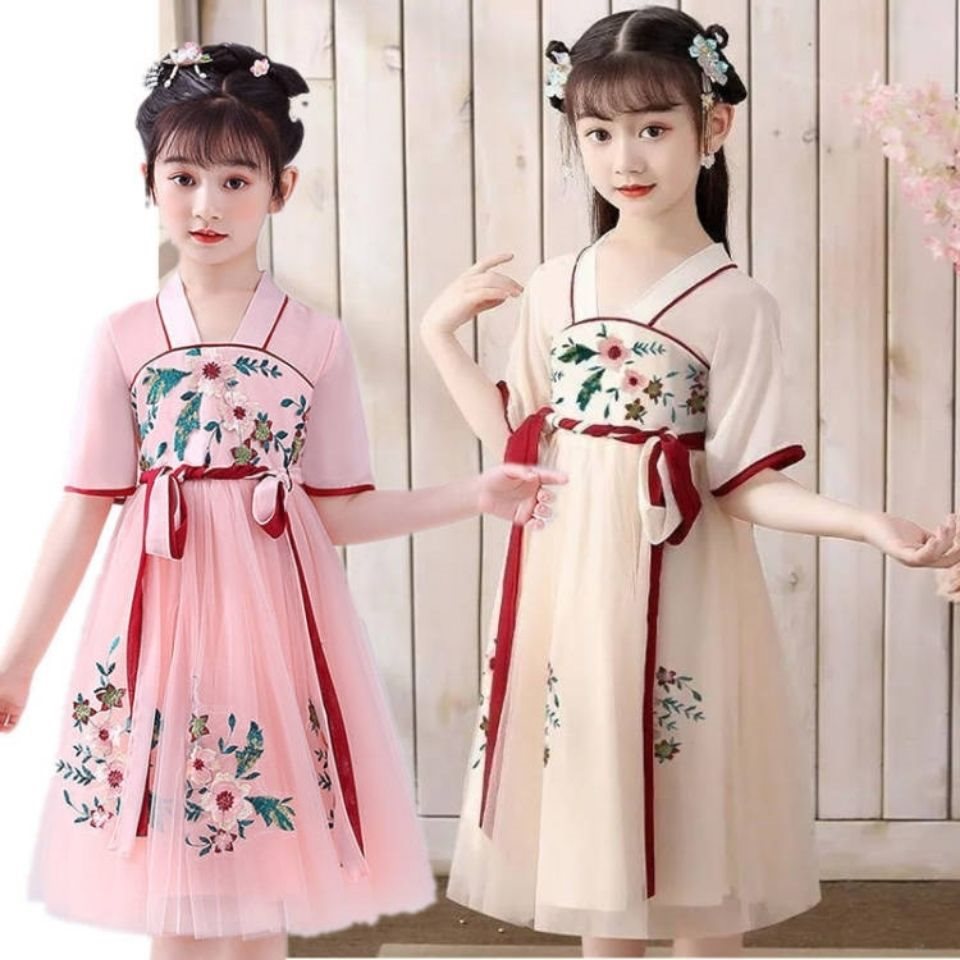 بدلة قديمة شيفون للفتيات من Hanfu بأكمام قصيرة للأطفال، فستان جنية عتيق على الطراز الصيني للفتيات، فستان بدلة تانغ لفصل الصيف