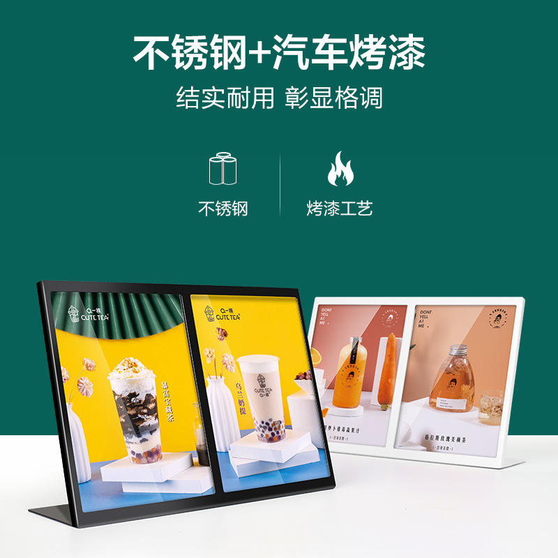 A4 بطاقة طاولة معدنية سطح المكتب بار تصميم الحليب الشاي متجر الفولاذ المقاوم للصدأ قائمة الرف سعر بطاقة العرض بطاقة الطعام KT المجلس